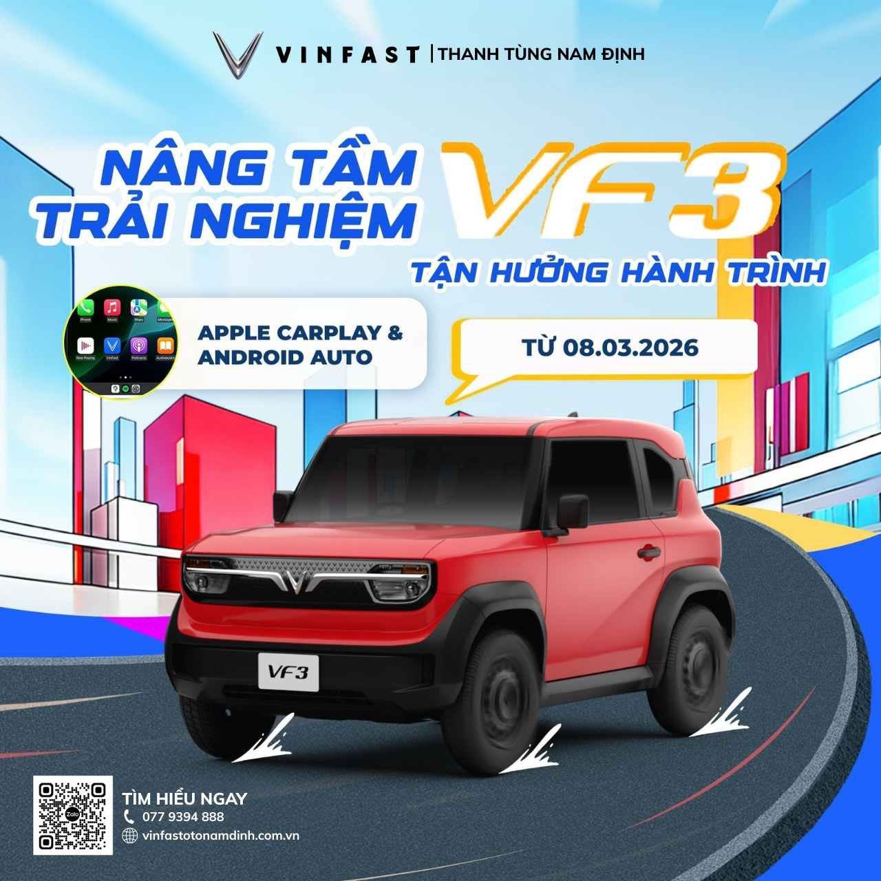 Với mong muốn không ngừng nâng cao trải nghiệm kết nối thông minh – hiện đại – thuận tiện trong quá trình sử dụng xe, VinFast trân trọng thông báo triển khai chương trình nâng cấp Apple CarPlay/Android Auto dành cho khách hàng VF 3 phiên bản Tiên phong.