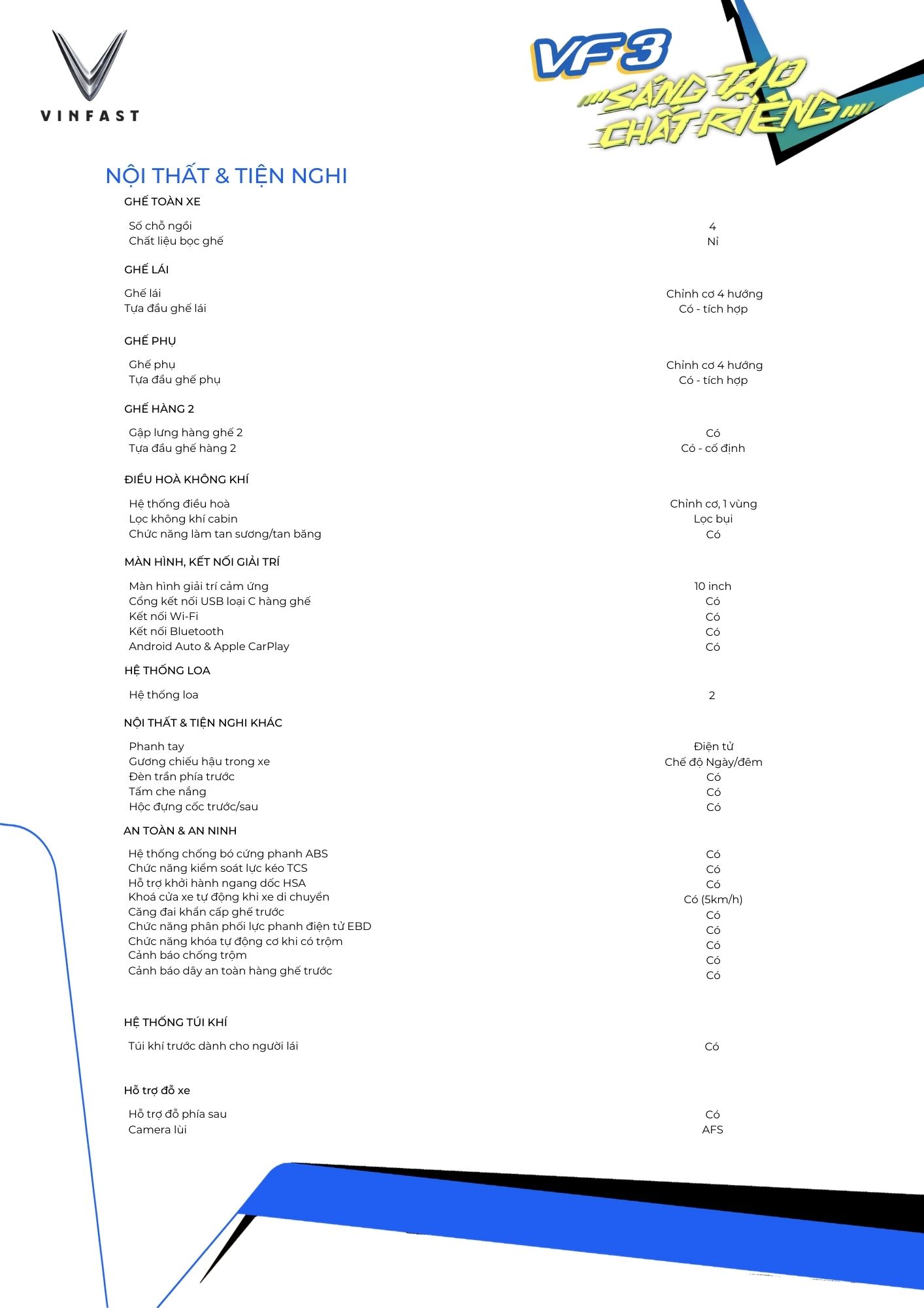 Nhờ sự kết hợp giữa kích thước nhỏ gọn và không gian nội thất thông minh, VF3 trở thành lựa chọn lý tưởng cho các gia đình nhỏ hoặc nhóm bạn muốn tận hưởng những hành trình tiện nghi và linh hoạt.