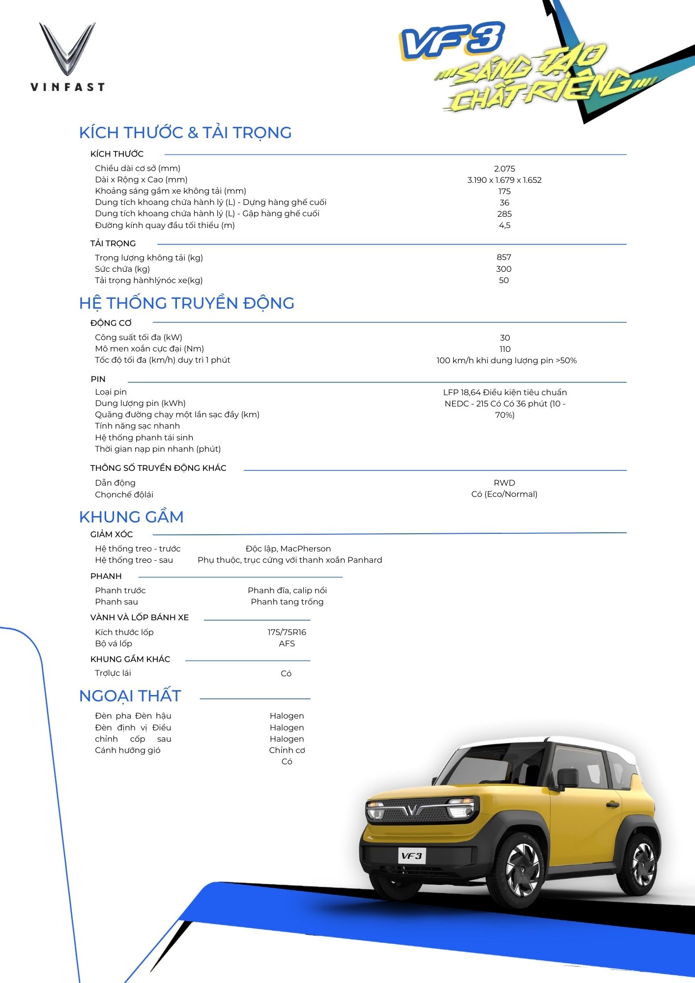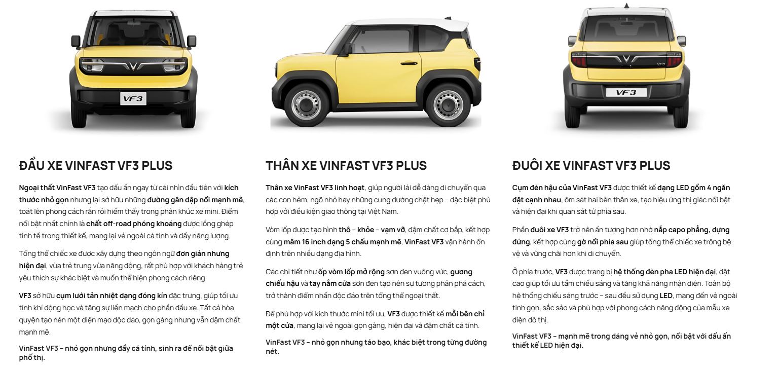Vượt lên trên một phương tiện di chuyển thông thường, VinFast VF 3 là biểu tượng mới mang tính cách mạng trong cuộc sống đô thị. Với thiết kế hiện đại, hiệu suất vận hành linh hoạt, tính năng an toàn tiên tiến, cùng chi phí vận hành siêu rẻ, VF 3 sẽ mở ra một cách tiếp cận hoàn toàn mới trong việc lựa chọn phương tiện di chuyển hàng ngày, mang lại sự thuận tiện, dễ dàng và đặc biệt thoải mái cho tất cả mọi người.