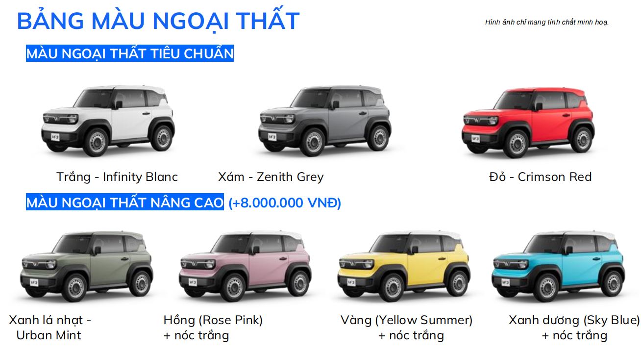 Với dải màu ngoại thất đa dạng và độc đáo, bao gồm 9 tùy chọn màu sắc trẻ trung và thời thượng, VF 3 là sự lựa chọn hoàn hảo giúp bạn thoả sức thể hiện sự khác biệt và cá tính của riêng mình. Dù bạn là ai, hãy lựa chọn màu sắc và trang bị VF 3 theo sở thích của bạn, cùng VinFast biến ước mơ của bạn thành hiện thực.